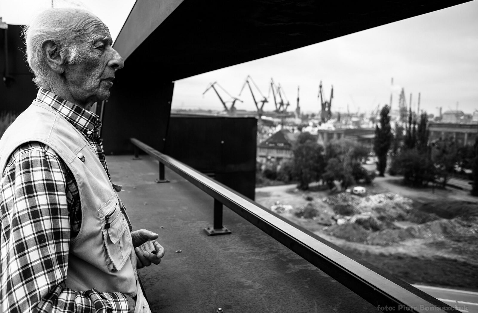 Zdjęcie nr 1 - panorama z dachu Europejskiego Centrum Solidarności. To i pozostałe zdjęcia z naszej wspólnej - ostatniej wycieczki - mają dla mnie szczególne znacznie. Ale szczególnie właśnie to zdjęcie gdzie w tle majaczą portowe dźwigi, symbol Gdańska. W grudniu 1970 roku, gdy ja miałem pół roczku, Tato leżał w Akademii Medycznej w Gdańsku. Szykowany był do operacji. Ale się nie doczekał - zamiast na salę operacyjną trafił w sam środek wypadków grudniowych - potrzebny były miejsca dla rannych stoczniowców. Nie działała łączność, płonął komitet, nie jeździły kolejki - na ulicach wojna. Wydaje mi się, że z tego dachu Tato ciągle patrzył na tamte wydarzenia i cały czas miał je przed oczami. A może tylko tak mi się wydawało?